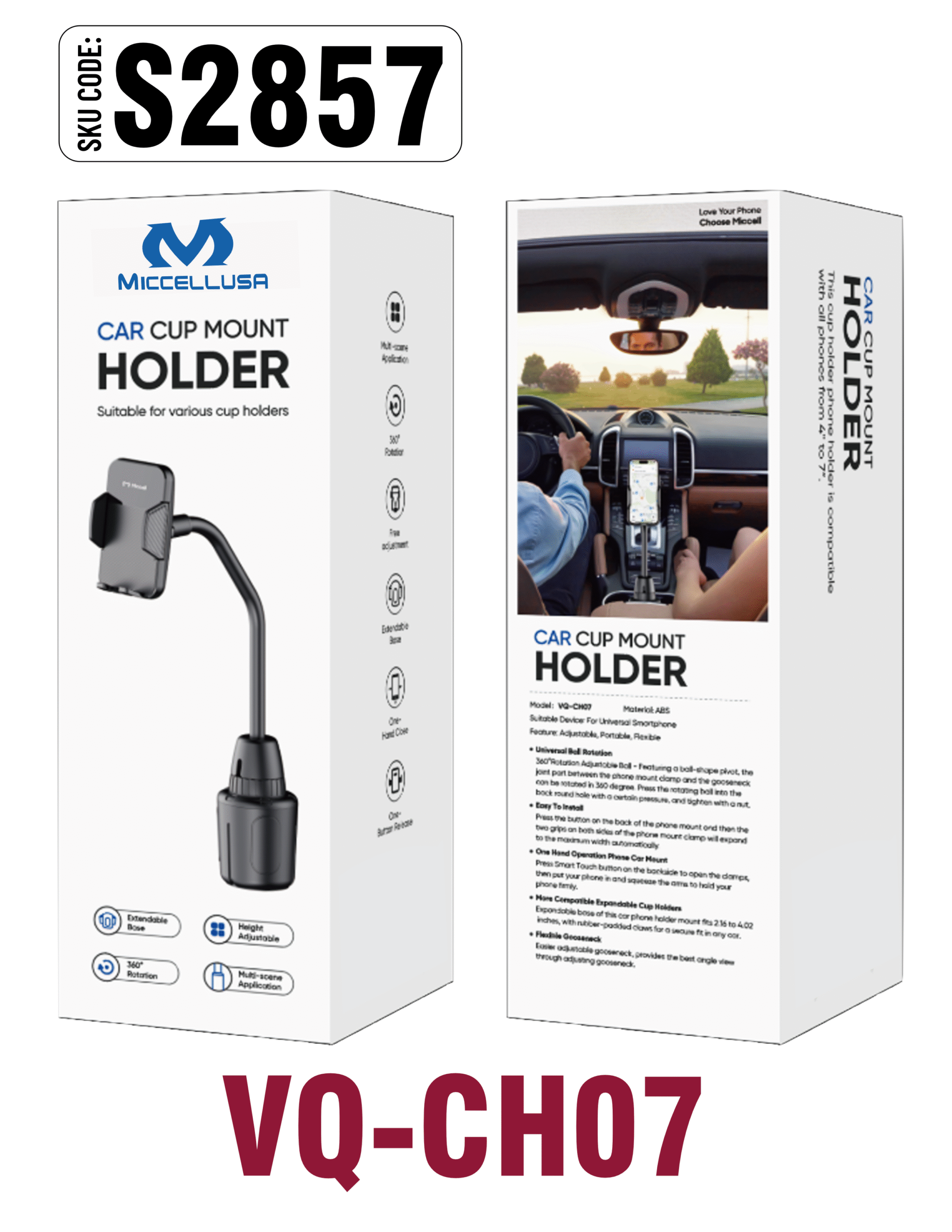 Keep your smartphone secure and accessible in your vehicle’s cup holder with the S2857 Miccell Car Phone Holder (VQ‑CH07). This mount is specially designed to deliver a stable, convenient grip without blocking your dashboard or windshield.
