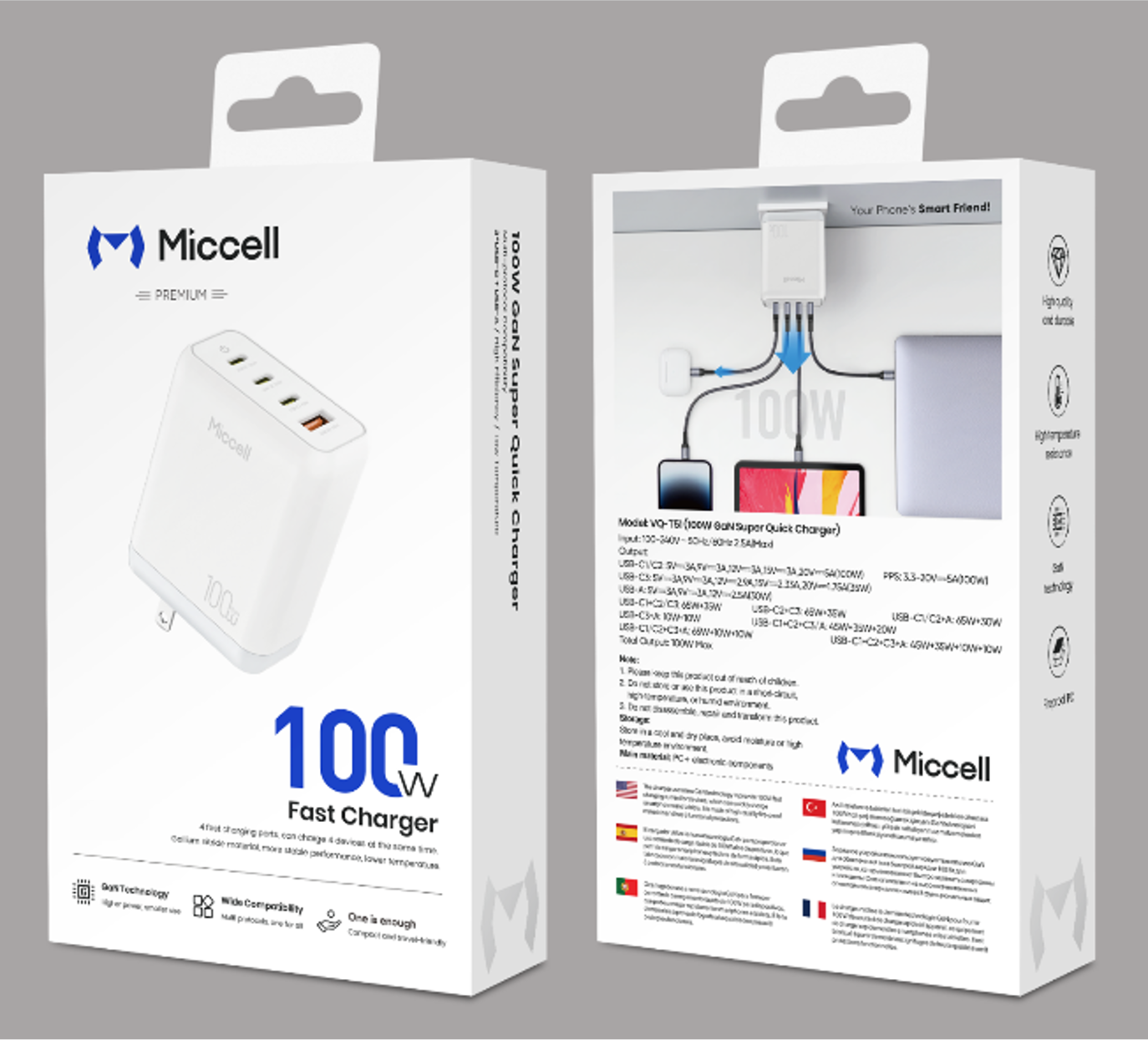 Power up all your devices in a flash with the Miccell 100W 4-Ports Super Quick Charge Wall Charger (VQ-T51). Designed for heavy users and power-hungry setups, this charger delivers high-speed charging across four ports — perfect for laptops, tablets, phones, and more simultaneously.